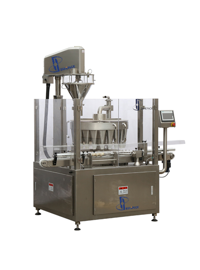 旋轉(zhuǎn)式充填機(jī)具有很高的生產(chǎn)效率和生產(chǎn)速度,即使在非??量痰纳a(chǎn)要求下,旋轉(zhuǎn)式充填系統(tǒng)將物料連續(xù)的分發(fā)到旋轉(zhuǎn)的多工位漏斗里,瓶子在漏斗下,一個(gè)瓶子對(duì)應(yīng)一個(gè)漏斗,不等距螺旋和星形轉(zhuǎn)盤將瓶子均勻的對(duì)應(yīng)到每一個(gè)漏斗下同步旋轉(zhuǎn)并振動(dòng),螺桿計(jì)量機(jī)精確的將物料充填到漏斗里,然后物料在星形轉(zhuǎn)盤旋轉(zhuǎn)四分之三圈的時(shí)間內(nèi)從漏斗落到瓶子里,特別適用于瓶子口徑小,但包裝速度要求高的各種粉末和小顆粒物料。