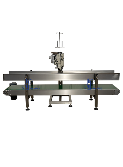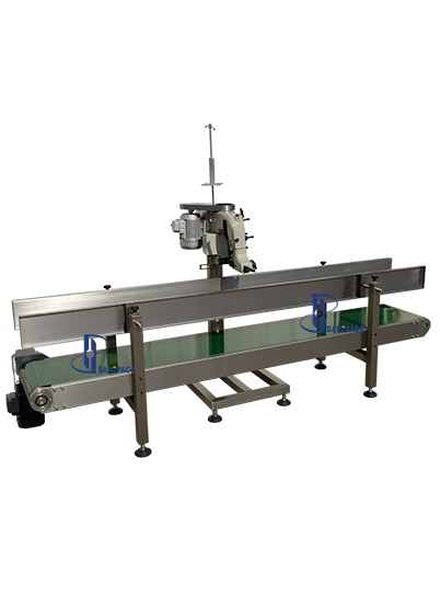 工作方式:裝縫包機裝配在輸送機上;開啟電源后輸送機開始運轉(zhuǎn),向前輸送裝滿物料的袋子,當(dāng)袋子到達(dá)縫包機壓腳處,接近開關(guān)感應(yīng)到袋子自動啟動縫包機,運行到設(shè)定的時間達(dá)到時自動停止,縫好每一袋時手推袋角切刀剪切線辮。